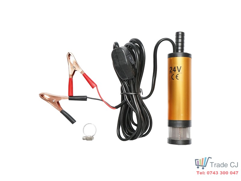 Pompa submersibila rezistenta de 24V, cu carcasa din aluminiu, ideala pentru transferul de motorina sau apa. Compacta si usor de utilizat, cu clesti pentru conectare directa la baterie.